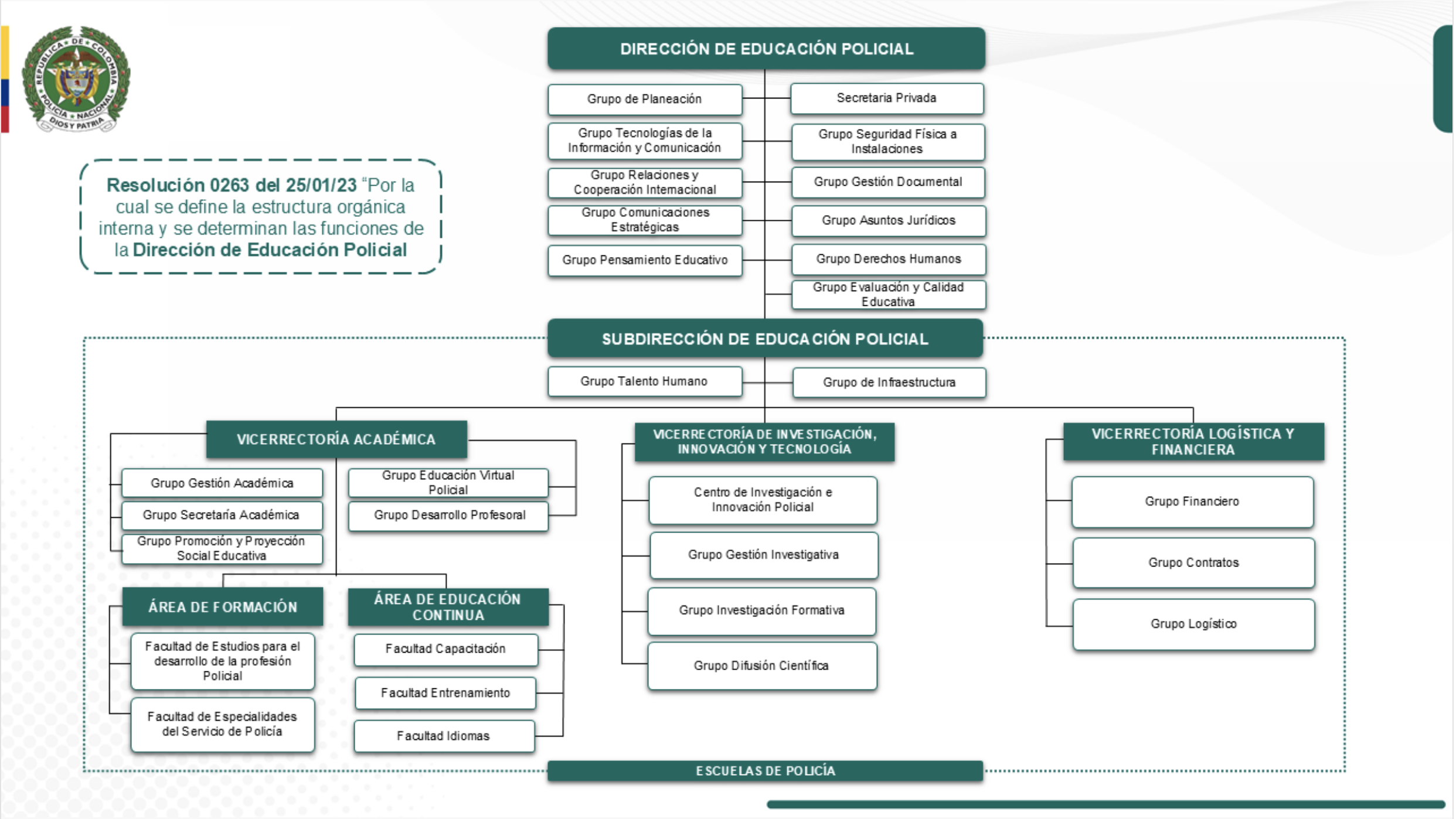 Direccionar la formación integral del talento humano de la Policía Nacional, a través del Proyecto Educativo Institucional, en cumplimiento de las funciones de Docencia, Investigación y Proyección Social, con el fin de contribuir a la satisfacción de las necesidades de seguridad y convivencia ciudadana.